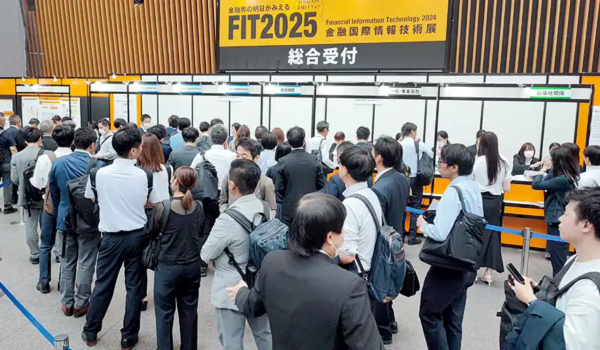 日本最大の金融ITフェア「FIT2025(金融国際情報技術展)」(主催=日本金融通信社、後援=全国銀行協会など金融13団体)が10月9日、東京国際フォーラム(東京都千代田区)で始まった。開場前から多くの金融関係者が詰めかけ、金融関連のテクノロジーに関する最新情報をいち早く入手しようと展示ブースやセミナー会場に足を運んだ。