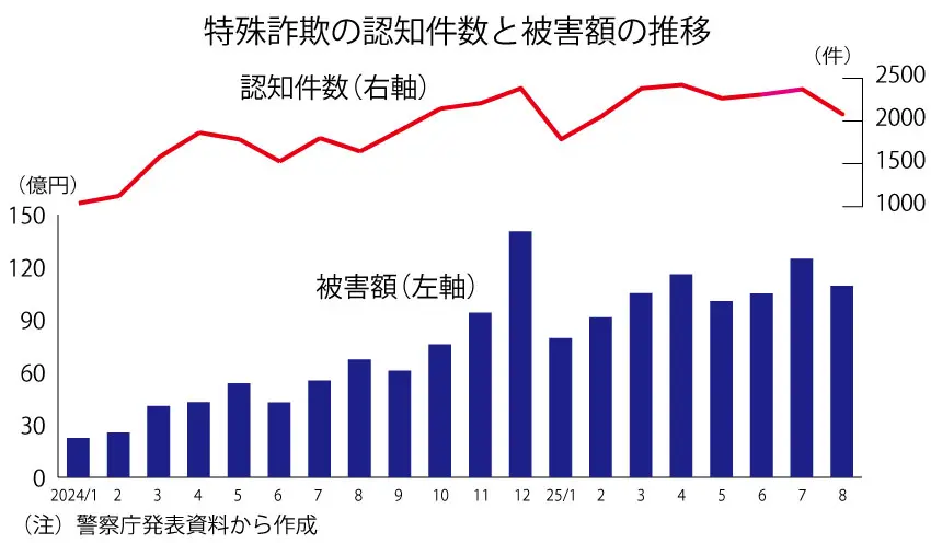 警察庁が10月2日に発表した、8月末(2025年1~8月の累計)の特殊詐欺の認知件数は1万7662件(前年同期比5255件増)、被害額は831億4000万円(同479億7000万円増)だった。