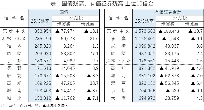 個別信金の状況をみると、「国債」の残高トップは京都中央信用金庫の3539億円(24年3月末比779億円減、▲18.1%)。次いで、浜松いわた信用金庫(静岡県)が2851億円(同506億円増、+21.6%)、稚内信用金庫(北海道)が2458億円(同32億円増、+1.3%)(表参照)。増加率では八幡信用金庫(岐阜県)が+7642.5%(24年3月末比増加額68億円)で首位。大手信金では播州信用金庫(兵庫県)が+314.0%(同1002億円)と大きく伸びた。24年3月末比で国債の残高が増加したのは104信金、減少が143信金。25年3月末時点で、国債を保有しない信金は7信金だった。