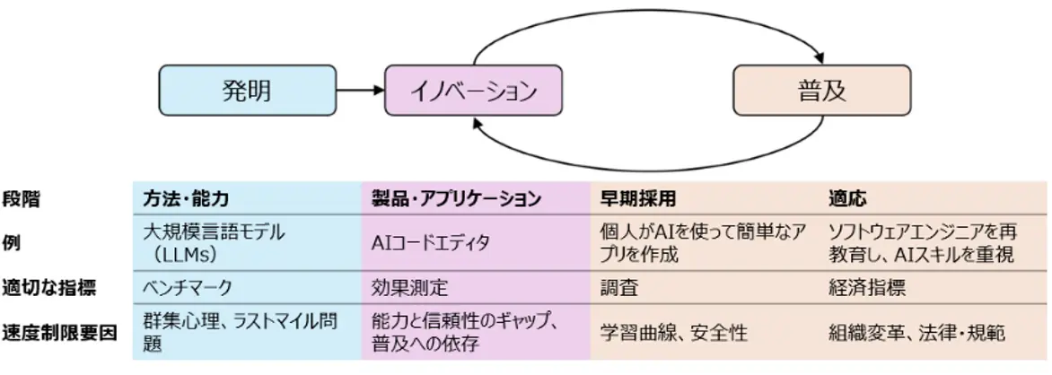 この逆説を説明する枠組みが、アーヴィンド・ナラヤナン(プリンストン大学准教授)とサヤシュ・カプール(プリンストン大学研究者)による「AI as Normal Technology」である。AIは電力やITと同じ汎用技術であり、社会に段階的に浸透していくと考えられる。測定可能な生産性向上が現れるのは、制度・ワークフロー・規制が適応した後である。