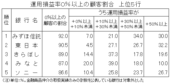25年3月末時点の運用損益率が0%以上の顧客の比率(運用損益別顧客比率の「0%以上 +10%未満」「+10%以上 +30%未満」「+30%以上 +50%未満」「+50%以上」の4区分の比率の合計)が最も高かったのはみずほ信託銀で92.0%(金融商品仲介の取扱実績のみの銀行は除く)。2位は東日本銀で90.5%、3位はきらぼし銀で89.0%だった。金融商品仲介の取扱実績のみの銀行を含めても109行で90%を上回ったのは2行のみで、前年同期の86行から急減した。