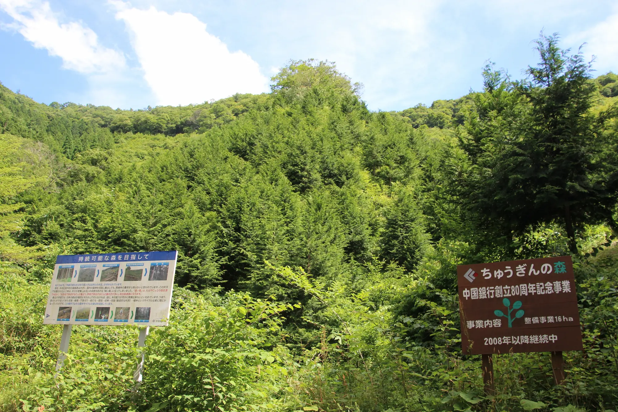 事業は2008年度に始まり植栽や下草刈り、間伐、枝打ちなどの森林整備を続ける。一帯は急斜面の山中にあり、真庭森林組合が手入れをしている。ちゅうぎんFGは資金面から活動をサポートするほか、地方創生SDGs推進部の担当者が現地を定期的に訪れ、森の再生を見守っている。事業は3期に分かれており、最終となる2027年度までに森林整備の活動資金として総額1,050万円を寄付する。