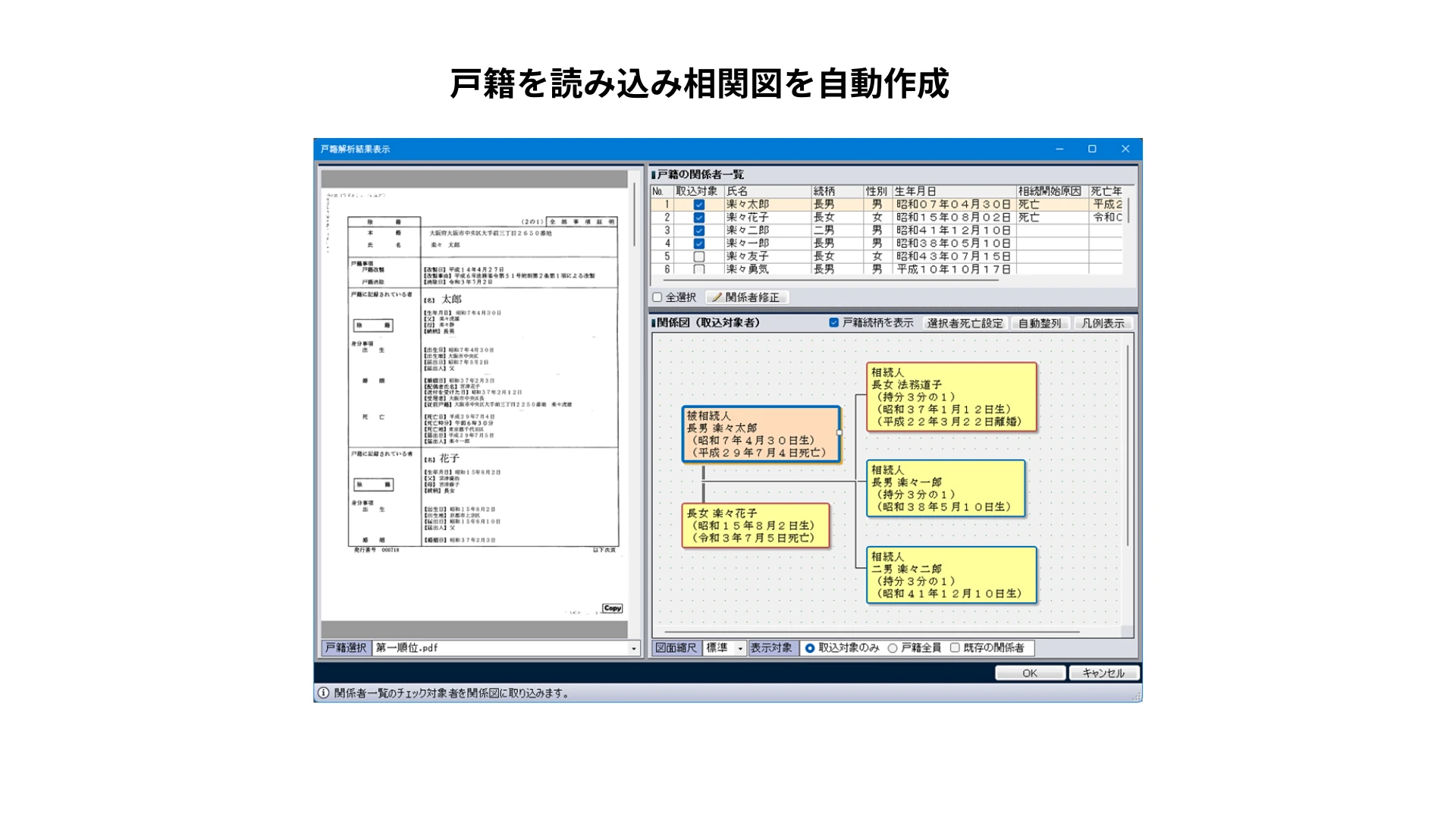 そこで注目したのが、サムポローニアが開発した相続財産管理システム「AI相続ミツローくん」だ。このシステムでは、戸籍謄本をAI-OCR技術で読み取ることで民法に即した相続人を自動で特定することが出来る。同じく相続関係図の作成、相続割合の計算も自動で出来る(画像)。