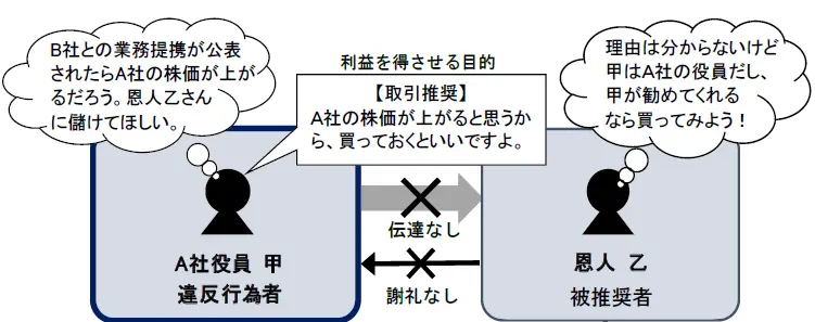 また、会社関係者や公開買付者等関係者は、他人に利益を得させる目的又は損失を回避させる目的をもって、当該上場会社等の取引を推奨すれば、たとえインサイダー情報そのものを伝達せずとも取引推奨規制違反(金融商品取引法167条の2)となる。
